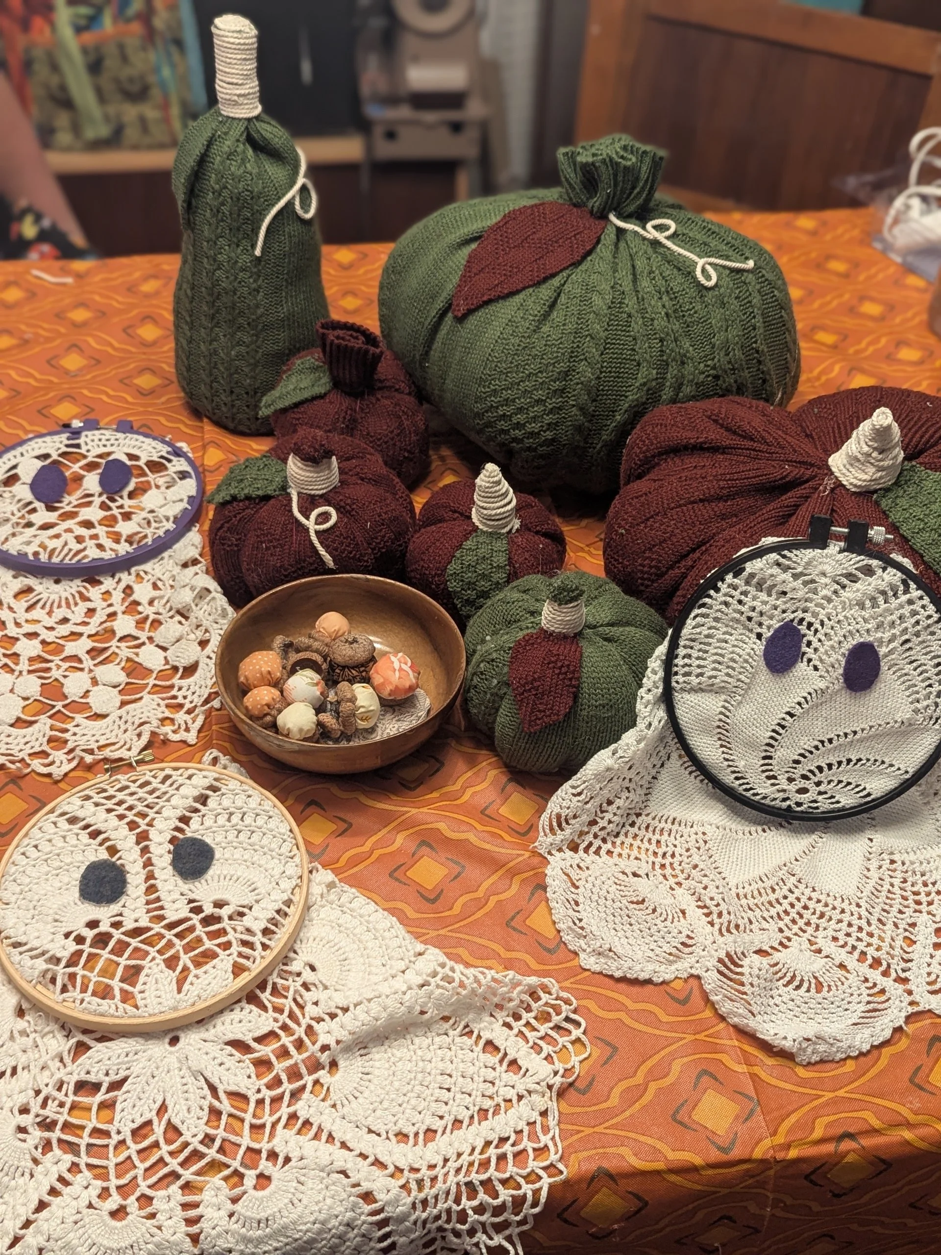 Fall is the favorite season in our household and this past weekend seemed like the true start of fall with cool weather and gray skies. IT felt like the perfect time to get to crafting. There are so many fun craft ideas to be found on Pinterest and IG. I had been dying to try sweater pumpkins and when I saw Fabric acorns on IG by @woodlark and doily ghosts by @thevettelfarm, my girls and I decided we had to try them. We weeded through our old fall and Halloween decorations to make room for new ones and these crafts made a great start. I love that they were pretty inexpensive as well. We got 2 sweaters at a thrift store for around $2 each and each made 3-4 Pumpkins plus leaves. We had the twine already. The acrons tops were found during a neighborhood walk and as we all know I have plenty of fabric. And finally the doilies were also a thirft store find and I already had the embroidery hoops. These were all so much fun! Which is you favorite?